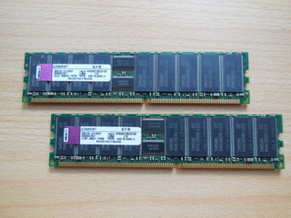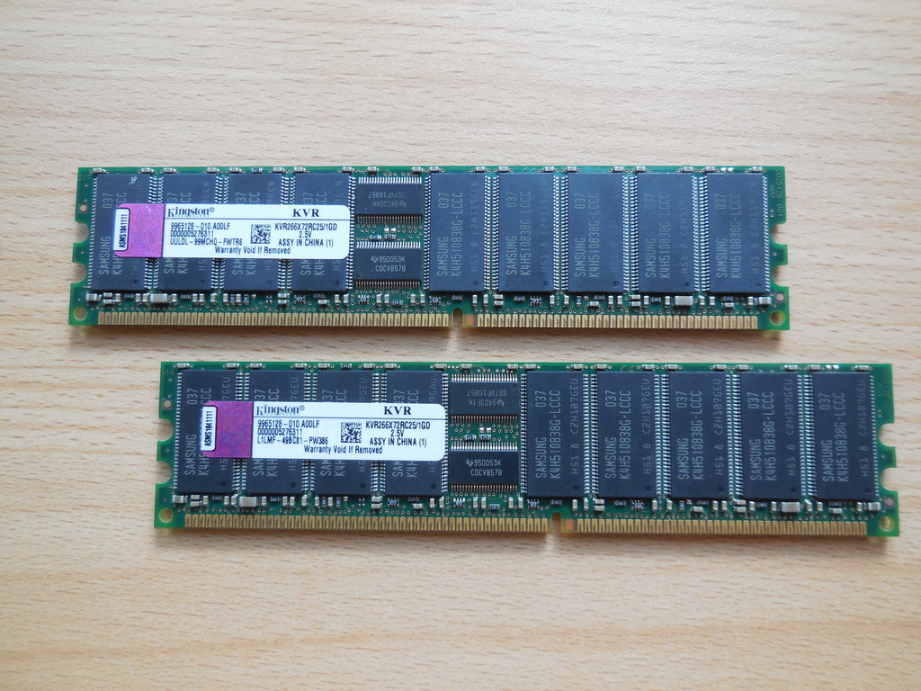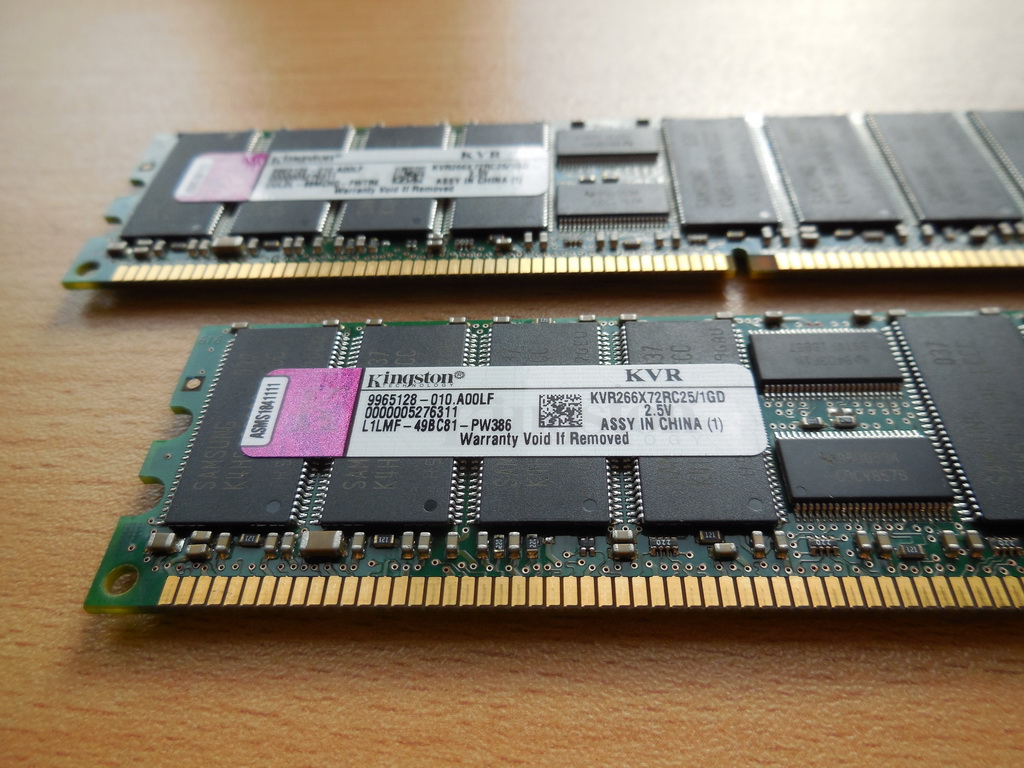 Tolik teorie a už nezbývalo nic jiného, než si jí ověřit v praxi. Chvíle hledání a doma se mi objevily dva 1GB DDR SDRAM moduly na 266MHz od Kingstonu (KVR266X72RC25/1GD).