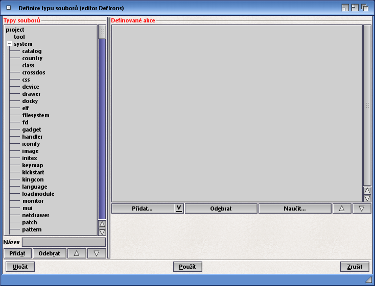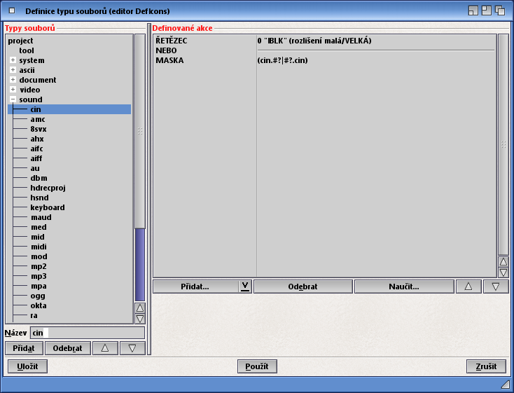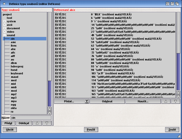 V levé části editoru naleznete již definované typy souborů, rozdělené do přehledných kategorií. Pokud na některý z těchto typů kliknete myší, v pravé části okna se objeví definované akce. Zde můžete definovat typ souboru podle řetězce v hlavičce souboru, masky (přípony), velikosti, atributů nebo makrotřídy. Úplně nejsnadnější je typ souborů nechat systém naučit. K tomu stačí mít několik souborů stejného typu, kliknout na tlačítko Naučit… a systém sám zjistí podobnosti a podle nich nastaví vyhledávaný řetězec. Pokud to není možné, lze nastavit klasicky masku (příponu) souboru.