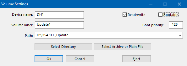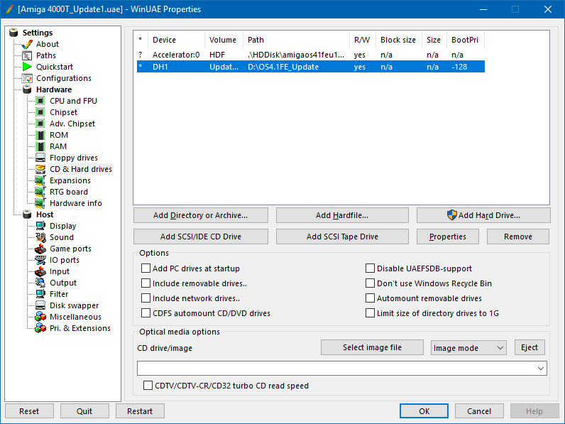 Nyní si stáhněte ze stránek Hyperionu nejnovější akutualizaci Update 1 a někam si jí uložte. Nyní přejdeme do nastavení emulátoru (F12) na záložku CD & Hard drives a zde si připojíme složku s aktualizací jako další disk. Toto je taky nová funkce emulátoru, v předchozích verzí toto nebylo ještě možné. Zde klikneme na tlačítko Add Directory or Archive…. Zde zadáme vše jako na obrázku a vybereme složku, do které jsme aktualizaci uložili. Vypnout volbu Bootable a OK (obr. 1).