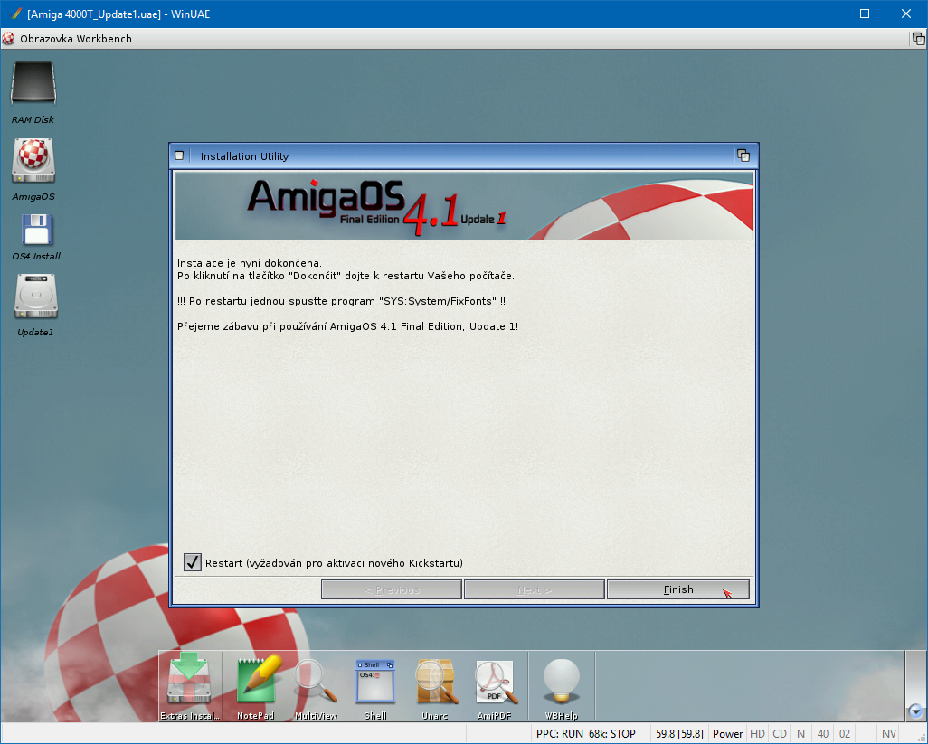 Každopádně aktualizace Update 1 společně s novou verzí emulátoru WinUAE zase posunula možnosti emulace AmigaOS 4.1 FE o krok dopředu. Trochu mně mrzí neaktuálnost české lokalizace systému, ale tady začínám chápat Víťu Šindláře v marném boji s Hyperionem. Aktuální verze češtiny se tak má objevit až v Update 2. Nicméně i tato verze češtiny je plně funkční.