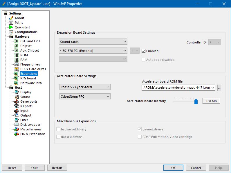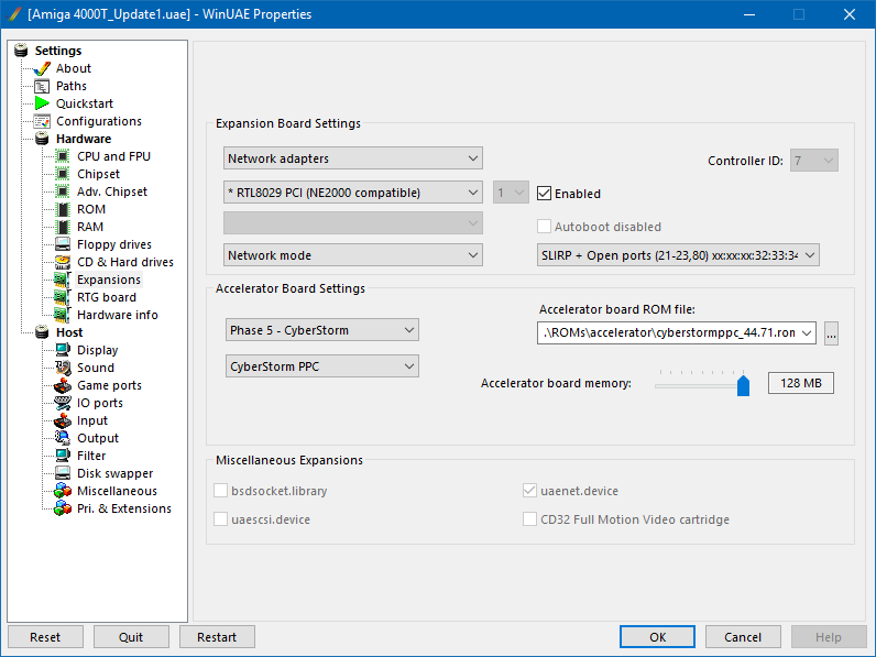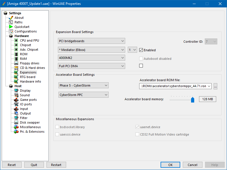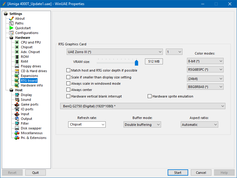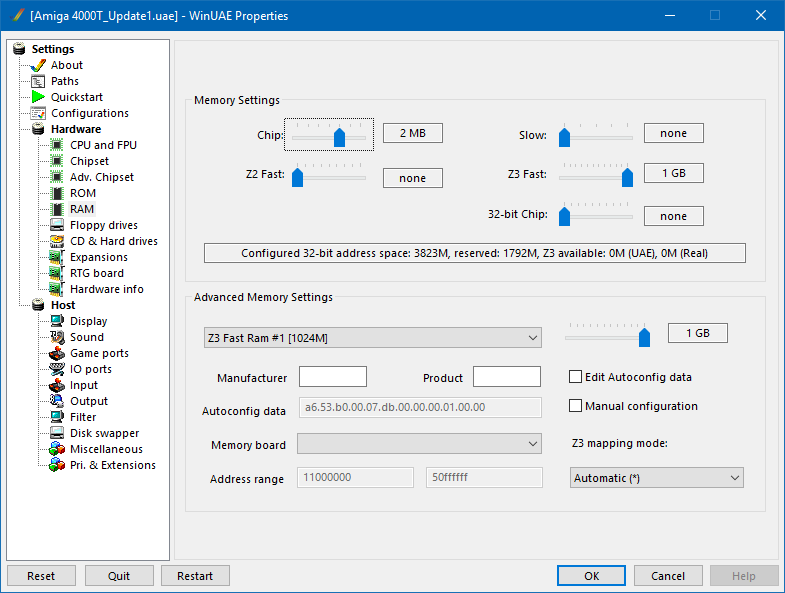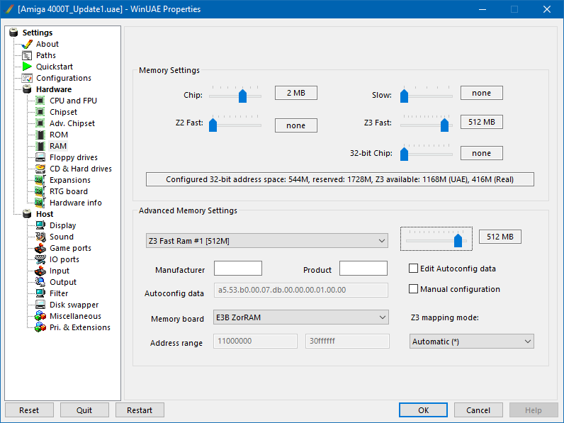 Tím jádru systému sdělíme, že chceme používat jako FAST RAM i paměť v Zorro III slotech. Ovšem pokud emulujeme grafickou kartu Picasso IV, je tak možno přidat pouze 512MB FAST RAM. Pokud však nainstalujeme grafickou kartu UAE_GFX, pak je možno nastavit až 1GB FAST RAM. O tom však později.