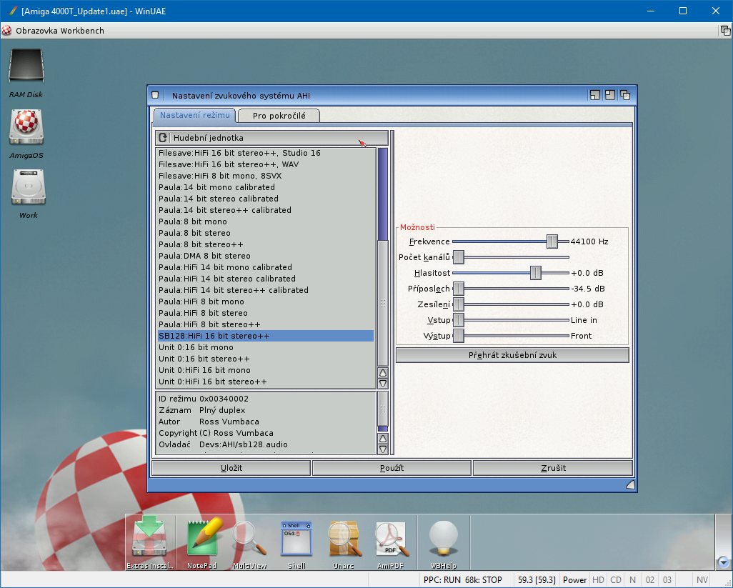 Nyní budeme muset doinstalovat odpovídající AHI ovladač, protože ho Hyperion ze systému pro klasické Amigy odstranil. Stáhneme si tento archiv a rozbalíme jej do systému. Po následujícím resetu počítače spustíme konfigurační editor AHI (Prefs/AHI), kde ze seznamu nejdříve vybereme SB128: HiFi 16 bit stereo++ (obr. 21), pak v záložce přepneme na Jednotka 0, kde vybereme to stejné (obr. 22). Uložit a hotovo.