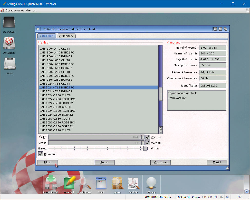 Po restartu vypadá samozřejmě vše úplně stejně, ovšem stačí si otevřít konfigurační editor ScreenMode a zmeny si všimneme hned (obr. 24). Na druhou stranu je třeba říct, že grafická karta UAEGFX je o trošičku pomalejší než emulace Picasso IV. Nicméně každé mínus sebou přináší i nějaké ty výhody a tou je v tomto případě možnost další zvýšení kapacity FAST RAM.