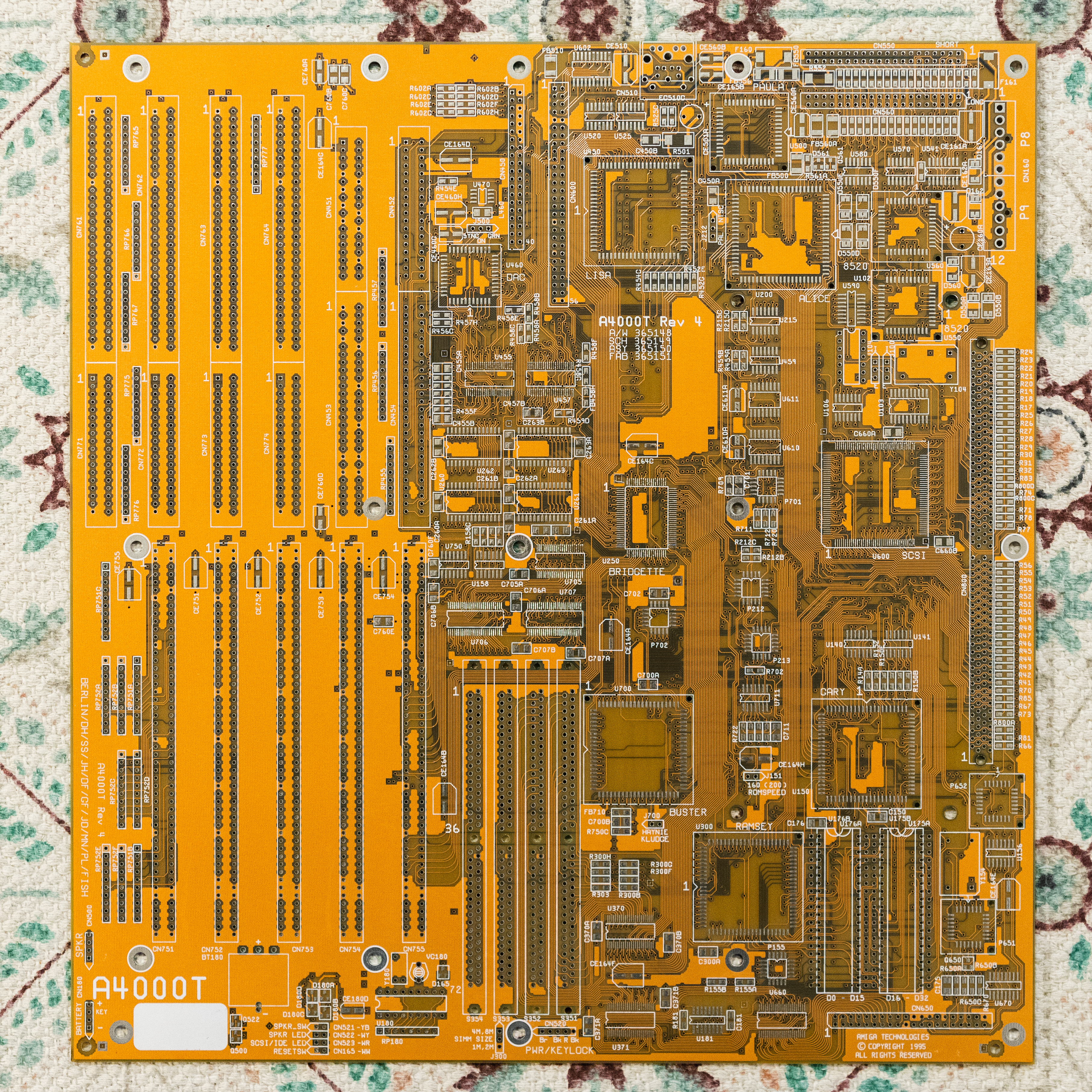 Základní deska Amiga 4000T (revize 4) vyrobená Amiga Technologies. Deska má označení „A4000T Rev 4“ a jsou na ní vidět sloty pro paměťové moduly SIMM (vlevo), BIOS ROM (dole) a místo pro čipset (pravý dolní roh). Amiga 4000T byla rozšířením původní A4000 (přidala více pozic pro diskové mechaniky a možnost procesorové karty 68060). Amiga 4000+ měla na stejné architektuře stavět, ale s modernějším CPU (68030/40 MHz) a pamětí až 128 MB.