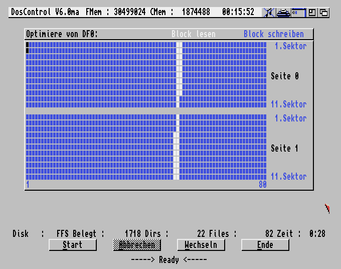 Silnou stránkou DC6 je především několik speciálních modulů pro práci s disketami, které nemají v této kategorii žádnou konkurenci. Za zmínků stojí především modul pro optimizaci disků a disket (obr.1), který patří mezi nejrychlejší optimizátory pro Amigu. Umožňuje optimalizovat veškerá zařízení v systému, ať už jde o OFS nebo FFS (poradil si však i s PFS3). U klasických disket je optimalizace dokončena přibližně do dvou minut. U pevných disků je rychlost optimalizace samozřejmě závislá na velikosti zařízení a rychlosti radiče.