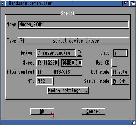 Spustíme MiamiDX... Přejdeme na záložku Hardware a klikneme na New (obr.1). Objeví se další okno (obr.2), v kterém si vybereme možnost Serial. Objeví se další okno (obr. 3), v kterém napíšeme název definovaného rozhraní a navolíme odpovídající ovladač. Jako ovladač zadáme název dříve zkopírovaného souboru DEVS:Networks/pcmser.device (Unit 0). Jako název lze zadat libovolnou zkratku (např. Modem_3COM). Zbytek necháme beze změn a klikneme na OK.