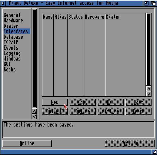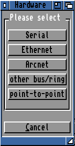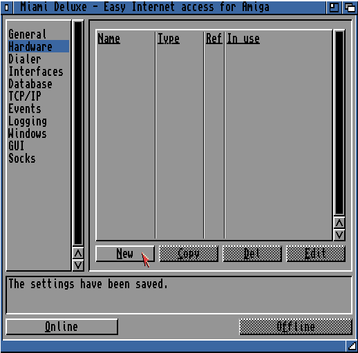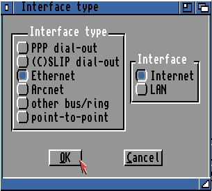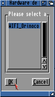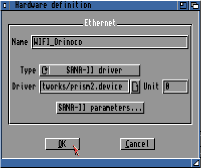 Přejdeme na záložku Hardware a klikneme na New (obr.1). Objeví se další okno (obr.2), v kterém si vybereme možnost Ethernet. Objeví se další okno (obr. 3), v kterém napíšeme název definovaného rozhraní a navolíme odpovídající ovladač. Jako ovladač zadáme název dříve zkopírovaného souboru DEVS:Networks/prism2.device (Unit 0). Jako název lze zadat libovolnou zkratku (např. WIFI_Orinoco). Zbytek necháme beze změn a klikneme na OK.