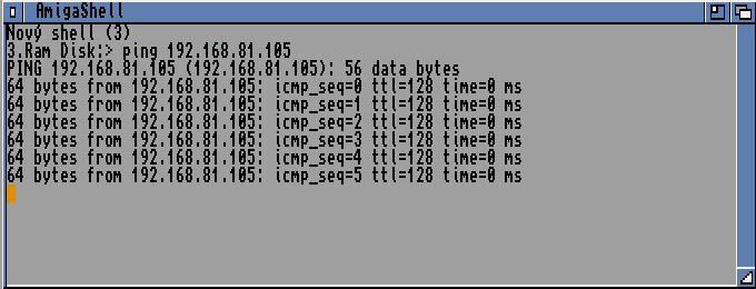 Jestli vše funguje jak má a neudělali jsme chybu někde v nastavení, si lze velice jednoduše vyzkoušet pomocí příkazu Ping. Předpokladem je samozřejmě již spuštěný TCP/IP stack (Miami, Genesis). Za zmínku také stojí to, že inicializace NMBD na klasické Amize trvá několik minut, takže mu dejte trochu času než budete kontrolovat jeho stav.