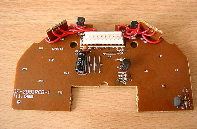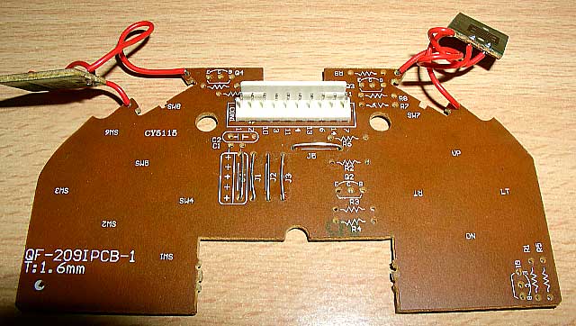 Pozorně si prohlédneme tišťák, je na něm spousta elektronických součástek (nějaké diody, kondenzátory a kdoví co ještě). Podle schématu klasického Amiga joysticku víme, že tyto věci vůbec nepotřebuje, Amiga dostává signál o stisknutí příslušného směru nebo spouště pouhým spínáním obvodu: směr-uzemnění. Proto všechny tyto součástky postupně odpájíme. Jedná se o zcela nezáživnou a namáhavou práci, ale dá se to zvládnout.