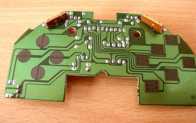 Vidíme tu černé plošky - elektrovodivé, které jsou spínány stiskem tlačítka, které také elektrovodivou ploškou propojí daný obvod. Ostatní plošky jsou pokryté zeleným izolačním nátěrem, aby nedošlo ke zkratům. Soustřeďme se nejprve na hvězdici 4 směrových tlačítek v levé části.