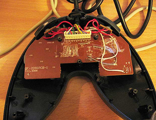 Nejdříve odstřihneme na kabelu konektor ke gameportu. Nyní můžeme gamepad rozebrat. Na zadní straně najdeme 4 otvory pro šrouby, pátý otvor je skrytý pod samolepkou s informacemi výrobce. Až vše odšroubujeme křížovým šroubovákem, můžeme odklopit zadní víko. Nyní vidíme tišťák ze kterého odpojíme kabel (nutno silou zatáhnout) a nyní lze již tišťák vyjmout a položit někam na stůl.