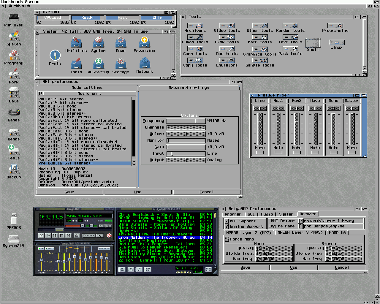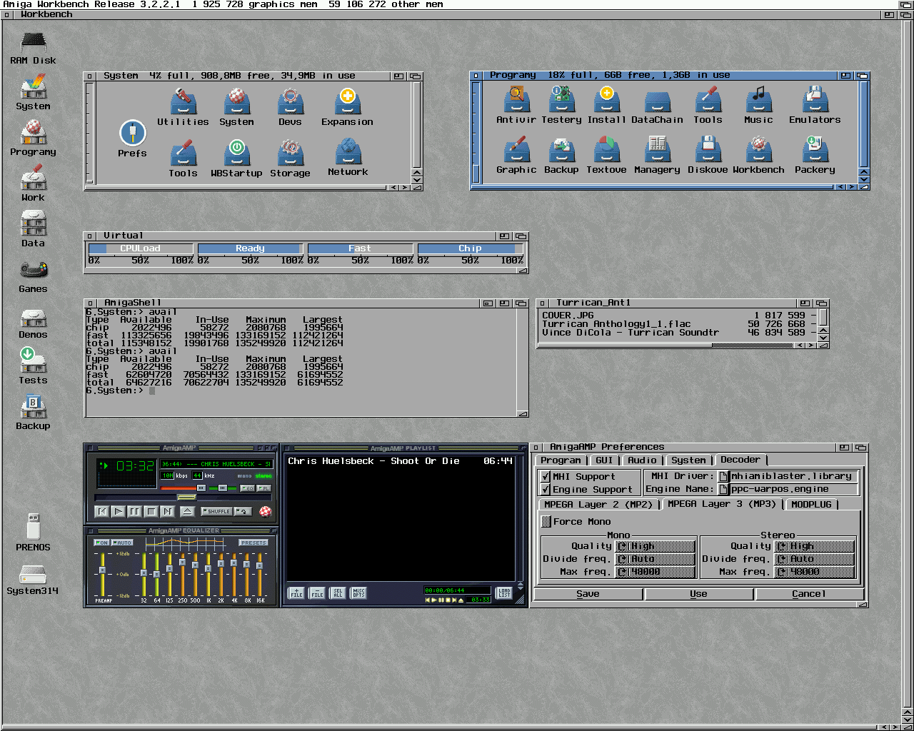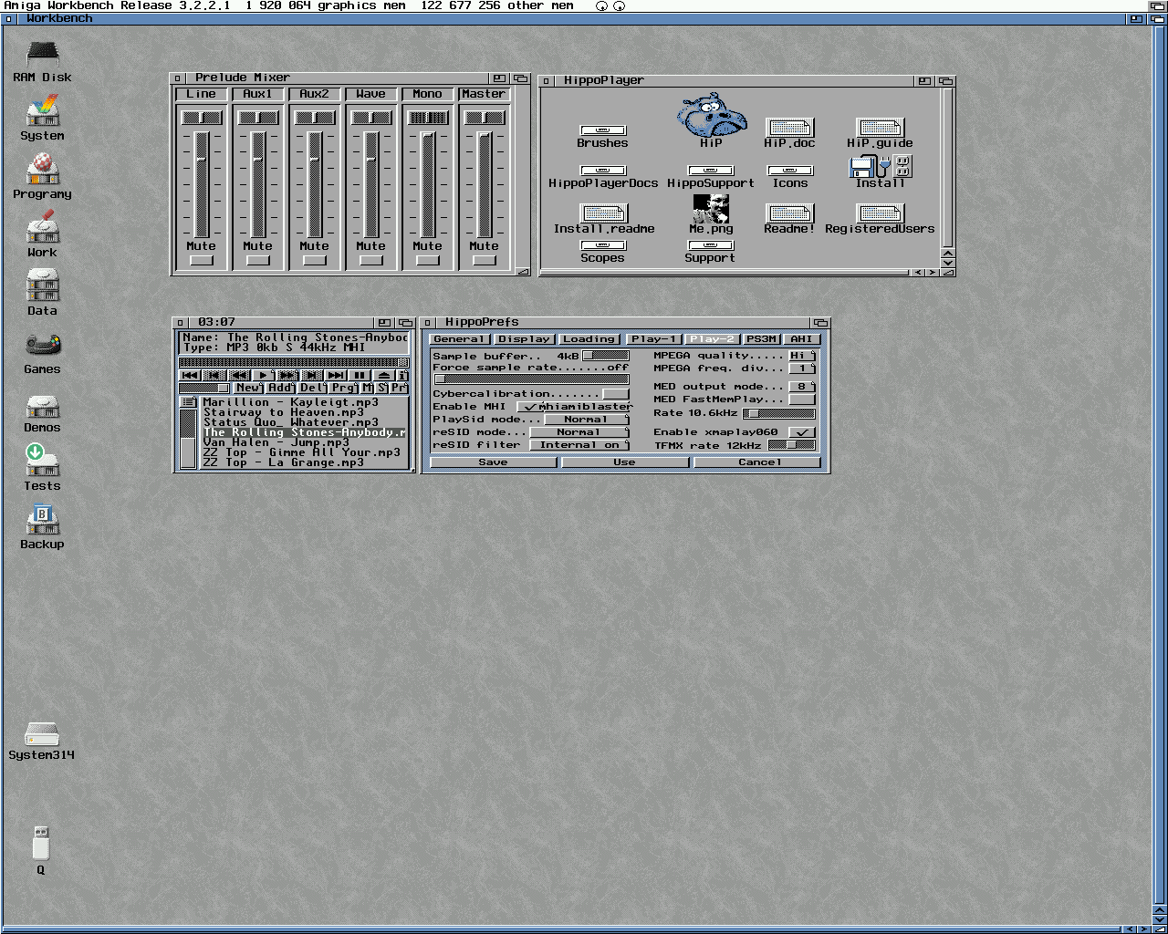 Po spuštění načítám první skladby. MP3 to chroupe jako rohlíky, vytížení CPU téměř žádné. Zajímalo mě, jak se vytíží systém při přehrávání MP3 s bitrate 320kbps. A reálně to nejde poznat. Ano, poznáte, že se vám někde ztrácí FAST RAM, skladba v takové kvalitě si ukousne kolem hodně megabajtů fastky, ale na výkon to nemá žádný vliv a na Amize můžete pracovat bez omezení.