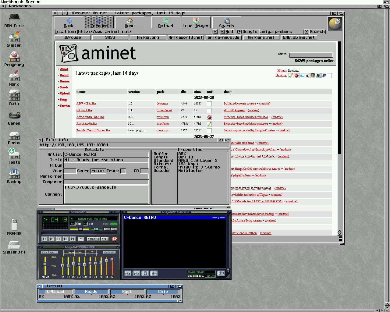 AmigaAmp umí také internetové rádio (streamy), je to volba Open URL. Amiga stíhá úplně v pohodě, hraje bez výpadků, dekodování MP3 bez problémů, vytížení CPU téměř žádné. Zajímavostí je, že přímo v AmigaAmpu můžete zvolit Record a vytvořit tak přímo záznam přehrávané skladby v MP3 formátu – a opět bez jakéhokoliv vytížení CPU.