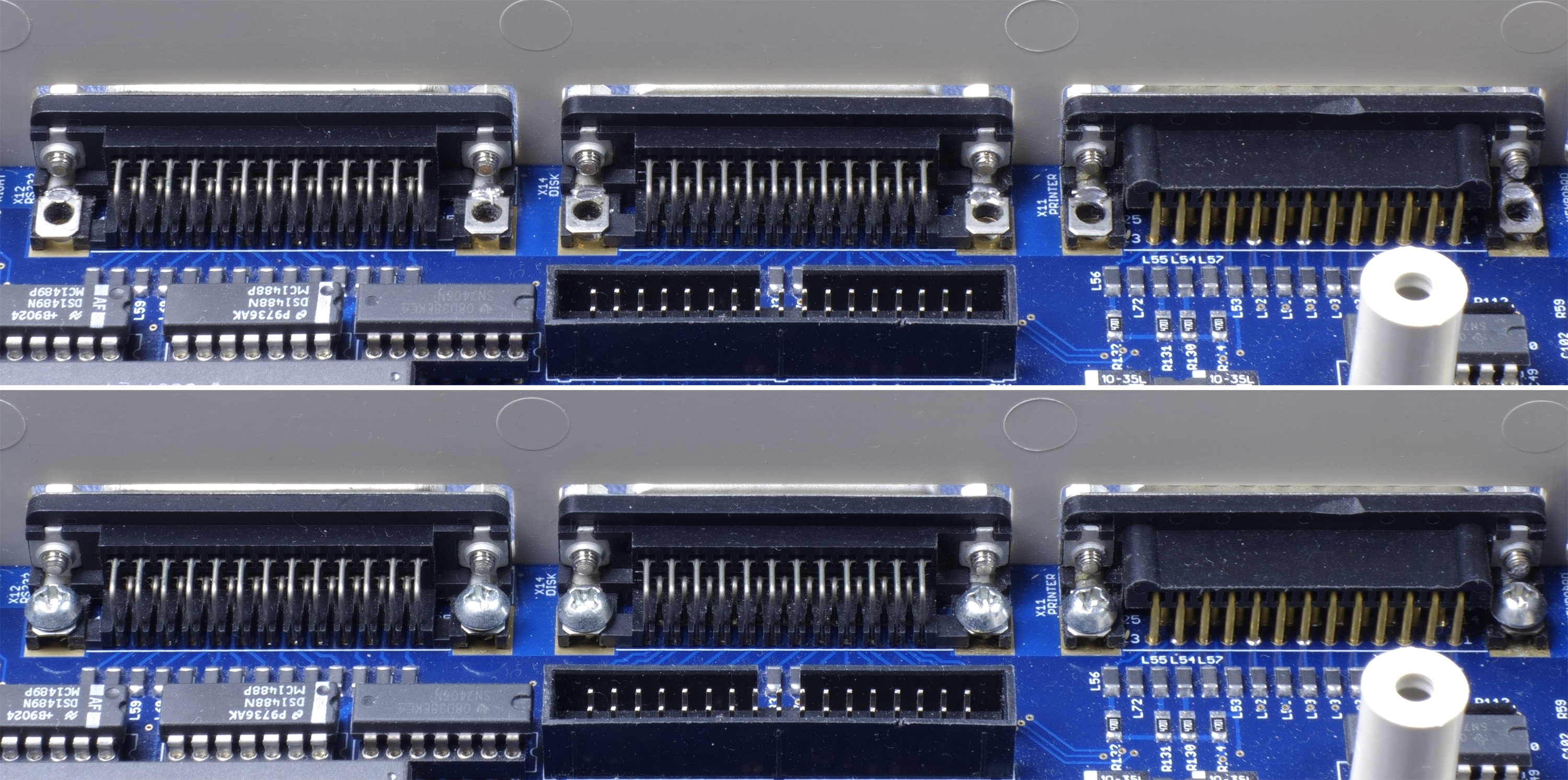 Nahoře konektory s otvory (plošky s otvory jsou připájeny), dole konektory jsou již uchyceny šrouby.