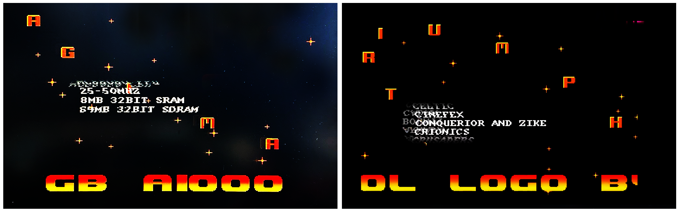 Vlevo boot intro na GBA1000, vpravo intro No Temptations od Triumph