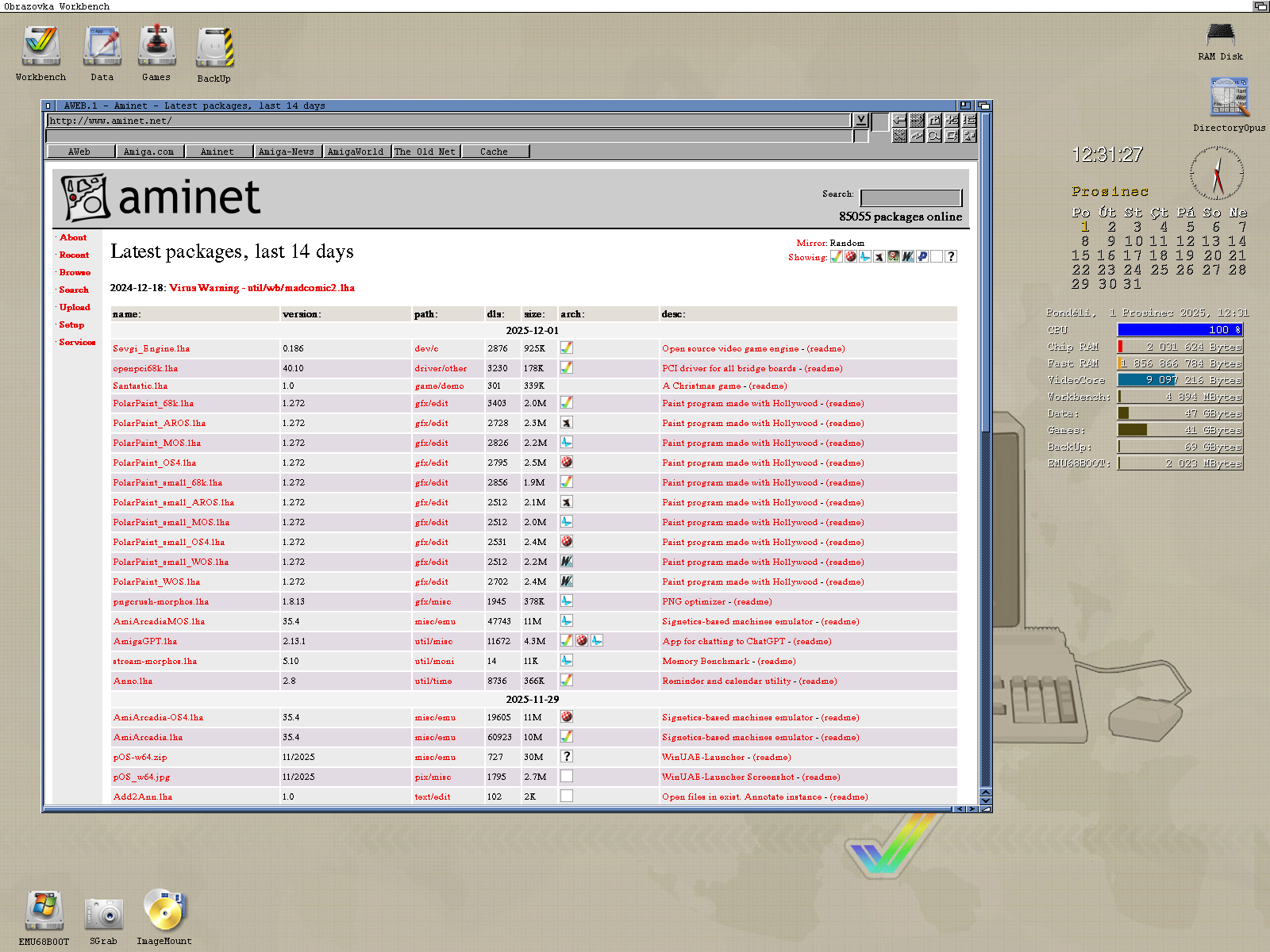 Nová verze prohlížeče AWeb 3.6 zobrazující stránky Aminet.