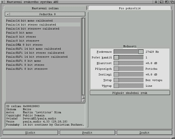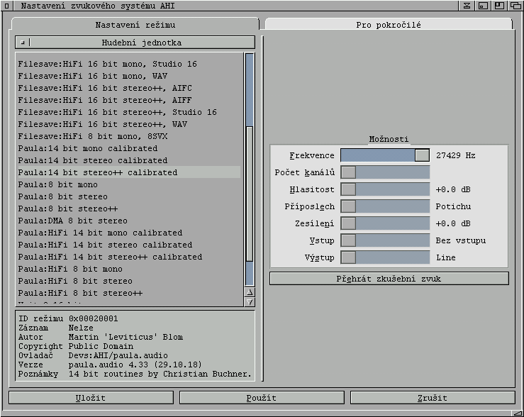 Jak ověřit funkčnost? Po nastavení AHI je vhodné jej otestovat. AHI Prefs v novějších verzích nabízí tlačítko Use (Použít) pro dočasné použití nastavení - můžete tak zkusit přehrát zvuk v nějaké aplikaci a ověřit, že vše hraje správně, než nastavení uložíte nastálo. Některé verze AHI Prefs či ovladačů mají i testovací tón. Pokud ne, lze jednoduše spustit libovolný AHI - kompatibilní přehrávač (např. systémový MultiView s datatype pro audio, nebo specializovaný hudební přehrávač) a zkusit přehrát zvukový soubor. Správně nastavené AHI se projeví tím, že zvuk vychází z očekávaného zařízení v odpovídající kvalitě. V opačném případě stojí za kontrolu, zda daný program opravdu používá AHI (některé starší mohou stále výstup posílat přímo na Paulu přes audio.device) - pak by bylo třeba v daném programu vybrat výstup „AHI“ nebo „Unit 0 / Music“ apod., pokud tu volbu nabízí.