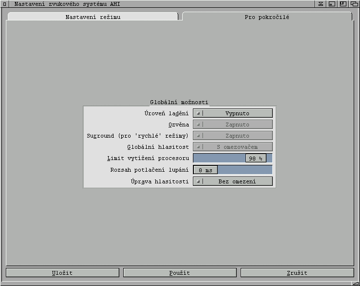 Na kartě Advanced settings najdeme globální volby AHI platné pro všechny jednotky. Patří mezi ně například nastavení Master Volume (hlavní hlasitost celého AHI mixu, s volbou, zda při přetečení provádět ořez - clipping - nebo ne), dále možnost zapnout efekty jako Echo (ozvěna) či Surround u Fast módů pro prostorovější zvuk, a v neposlední řadě nastavení CPU usage limit. Limit využití CPU určuje, kolik procesorového času smí AHI max. spotřebovat - při 100% využije vše potřebné pro nejlepší kvalitu, ale lze jej snížit, což AHI přiměje vynechat nekritické úkoly (např. snížit kvalitu interpolace) ve prospěch výkonu systému. Pro běžné použití se nechává 100%, ale na pomalejších Amigách lze ubrat, pokud při náročném zvuku „nestíhá“ celý systém.