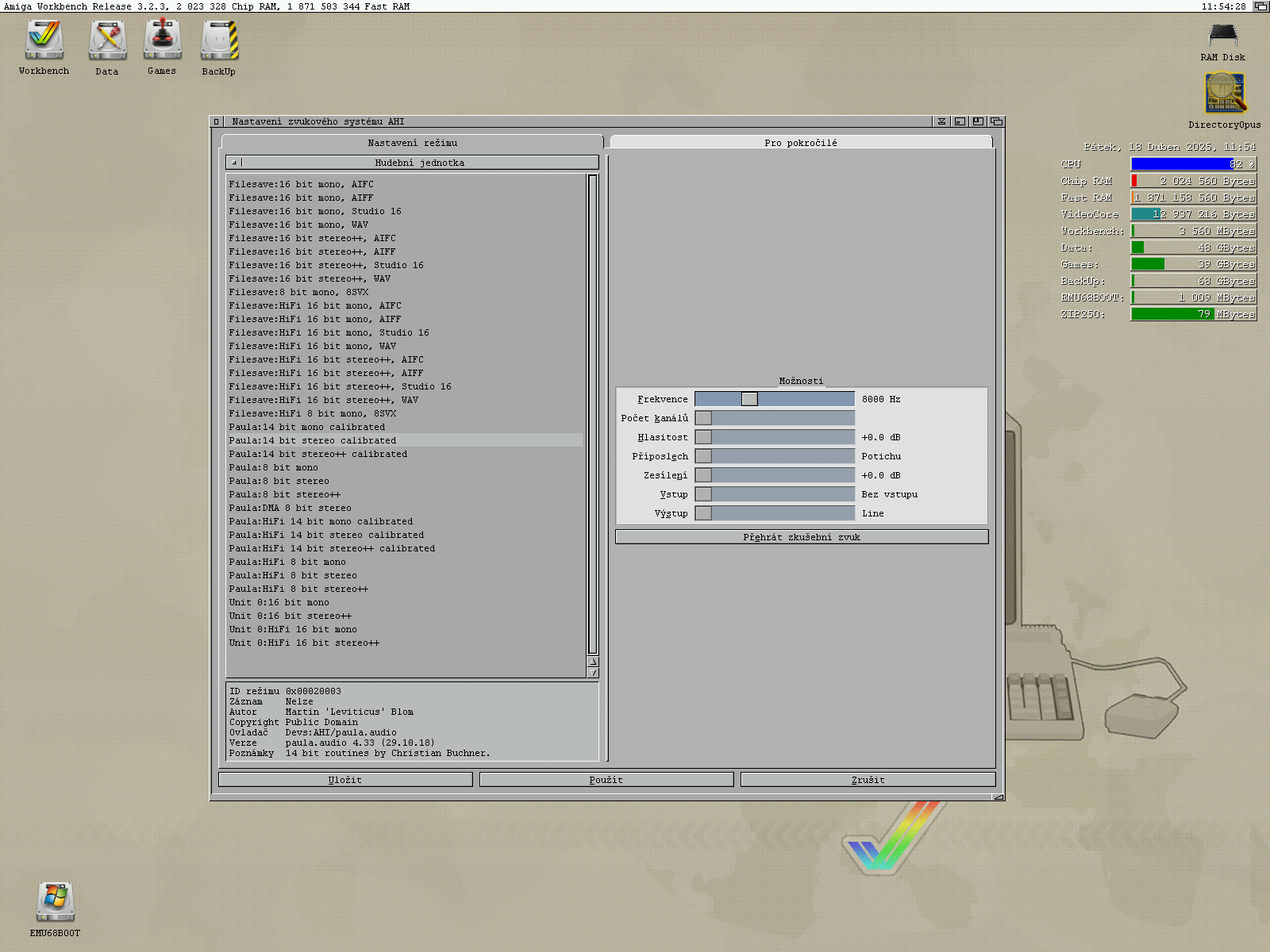 - Paula: 8 bit stereo - Základní režim, odpovídá původnímu 8-bitovému zvuku Amigy (4 kanály / stereo). Využívá minimální procesorový čas, kvalita zvuku je stejná jako přes audio.device.