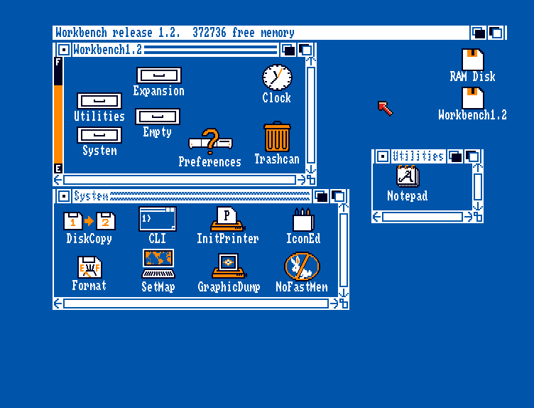 První, čeho si všimnete je to, že Workbench 1.2 má čistější a ucelenější vzhled. Ikony dostaly nový kabátek, nabídky jsou logičtější a práce s okny je plynulejší než kdy dřív. Rozhraní si drží typické modro-oranžové zabarvení, ale už nepůsobí tak chaoticky jako dřív.