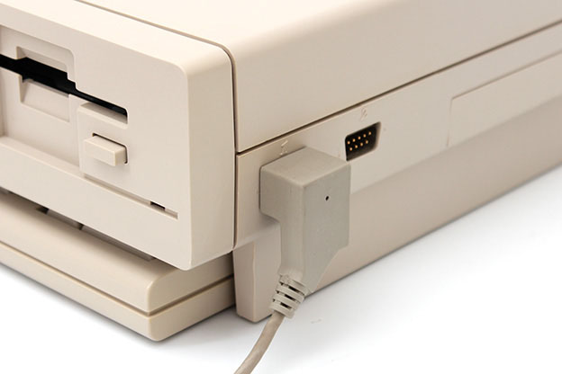 | Vstupy a výstupy: | 1x konektor po připojení klávesnice 1x paralelní Centronics port (DB-25F) 1x externí port pro připojení disketové mechaniky (DB-23F) 1x sériový port RS-232 (DB-25M) 2x RCA audio výstup 1x analogový RGB video výstup (DB-23M) 1x S-Video out (4-pin mini-DIN) 1x RF audio / video výstup (RCA) |