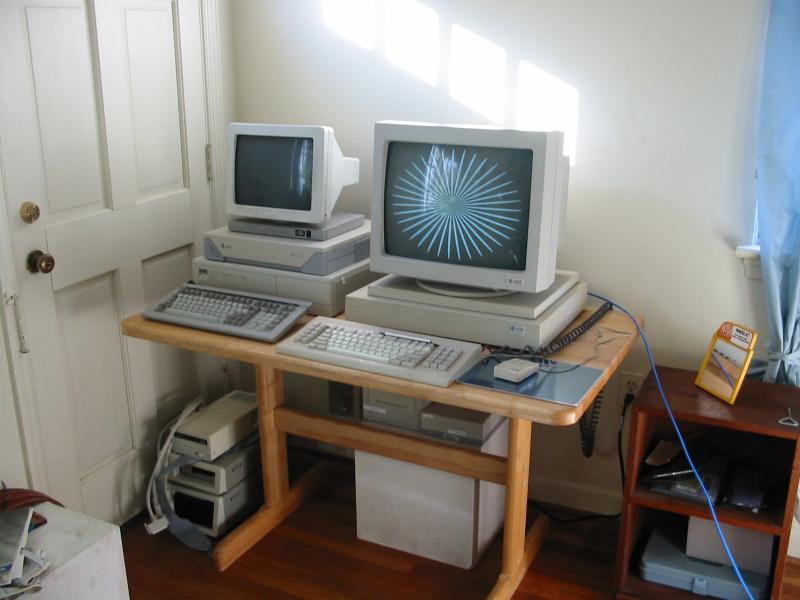 Počítačový pracovní stůl se třemi pracovními stanicemi UNIX, ta vpravo je Sun 3/60.