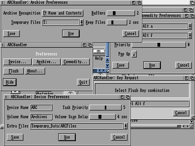 Jak již víte, program ARCHandler je komodita. Jako komodita samozřejmě umí zobrazit grafické uživatelské rozhraní. To je velmi dobře zpracované. Můžete jím nastavit řadu různých parametrů. Pro zařízení a pro svazek archivů můžete nastavit jiné názvy než "ARC" a "Archives". Dále se zde dá nastavit cesta k podpůrným programům a priorita souborového systému ARCHandleru.