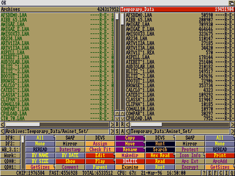 Různý pohled na LHA archivy: vpravo pohled AmigaDOSu, vlevo pohled ARCHandleru.