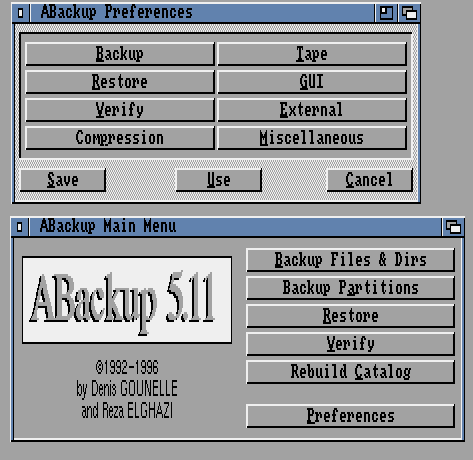 Snad nejlepším zálohovacím programem v PD světě je sharewarový ABackup, který se dostal již k verzi 5.11. ABackup je sice shareware, autoři požadují za program, pokud ho používáte, 20 USD, ale program sám nemá žádná omezení (takže se spoléhá na dobrou vůli). ABackup napsali dva lidé, Denis Gounelle a Reza Elghazi. Pocházejí z Francie, Denis Gounelle je ostatně podepsán i pod mnoha dalšími zajímavými PD programy.