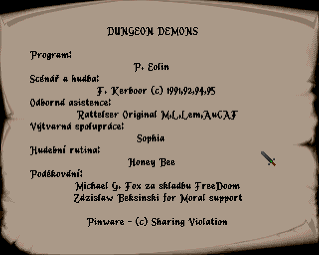 Textová adventura Dungeon Demons, vydaná v roce 1995 skupinou Hero Music Company, představuje neobvyklý výlet do hlubin klasického fantasy dungeonu - ovšem bez grafiky a bez animací. Hra se spoléhá výhradně na hráčovu představivost a schopnost porozumět příkazům a popisům, čímž odkazuje na zlatou éru interaktivní fikce osmdesátých let.