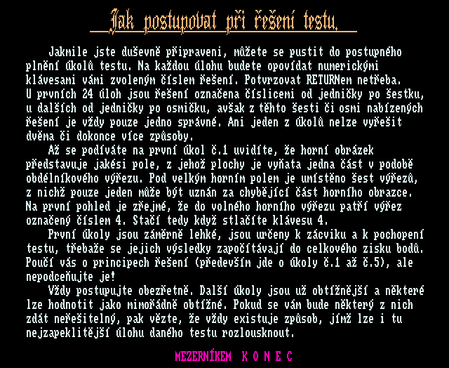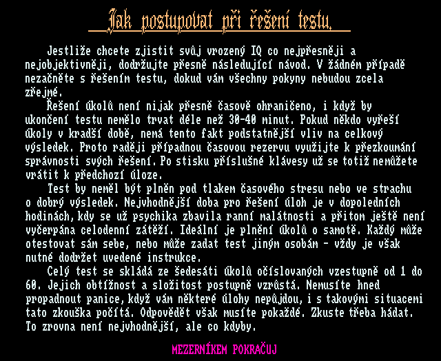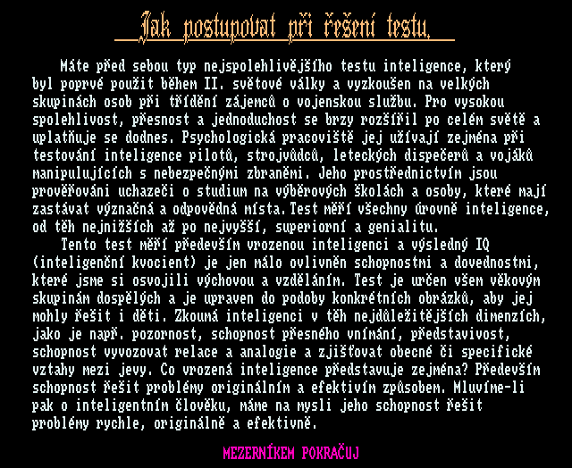 Na konci 90. let, kdy už většina vývojářů pro Amigu mířila k akčním hrám, emulátorům nebo portům z PC, přišel Striped Dog s něčím nečekaným: čistě logickou hrou ve formátu IQ testu. Hra s přímočarým názvem “IQ Test” vznikla v roce 1999 a slibovala, že na vaší Amize prověří paměť, logiku i prostorovou představivost. A to bez přehnaných efektů, ale s jasným cílem - zjisti, jak chytrý jsi.