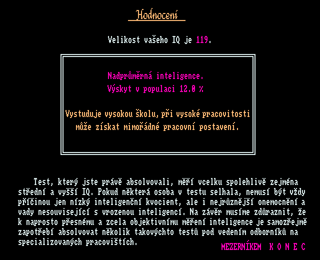 Na konci vás čeká vyhodnocení v podobě IQ skóre - čím rychleji a správněji odpovíte, tím lepší výsledek. Hra také umožňuje zapsání výsledku do tabulky nejlepších, takže můžete soutěžit s přáteli - nebo sami se sebou.