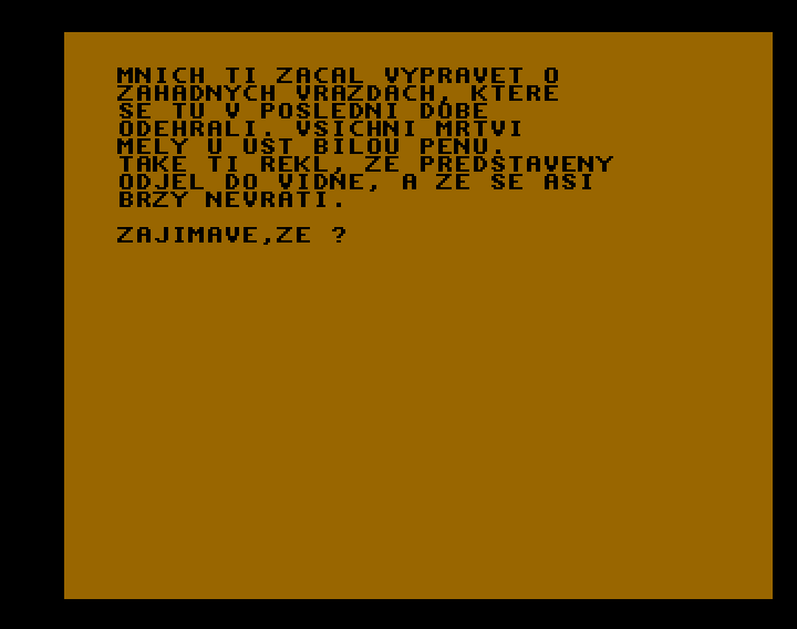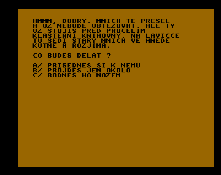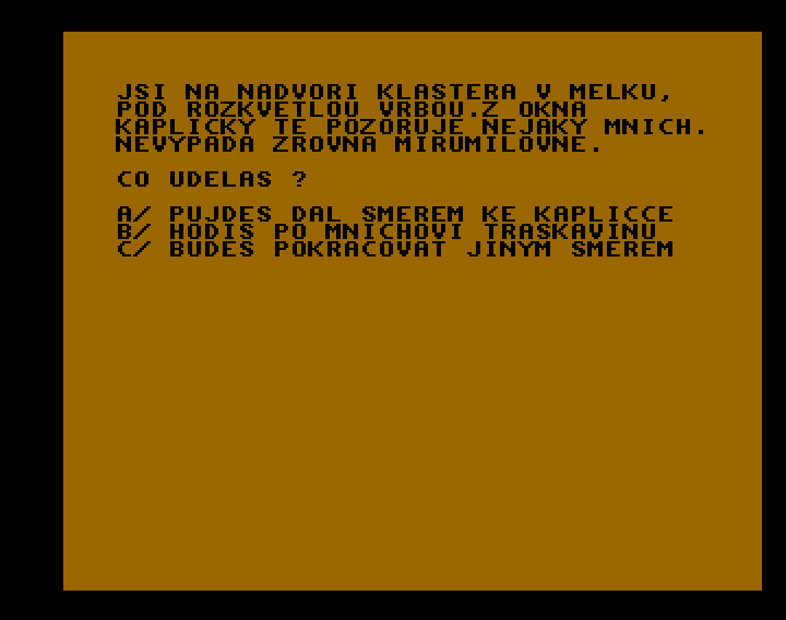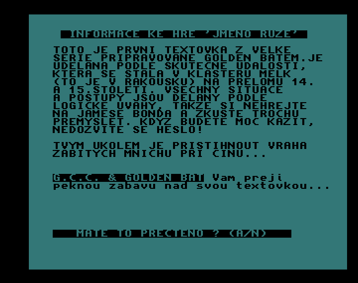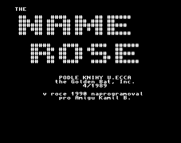 Kamil Blažek, průkopník českých surrealistických textovek pro Amigu, se už v roce 1990 pustil do ambiciózního projektu inspirovaného slavným románem Umberta Eca. Textová hra “Jméno růže” sice nenabízí licencovaný příběh, ale čerpá z něj náladou, prostředím a strukturou detektivního pátrání v klaustrofobním středověkém klášteře. Výsledkem je jedna z nejtemnějších a nejatmosféričtějších textových her, jaké kdy na Amigu vznikly.