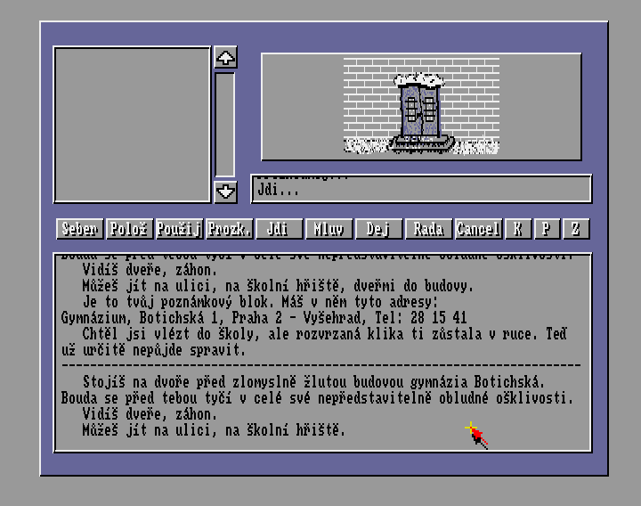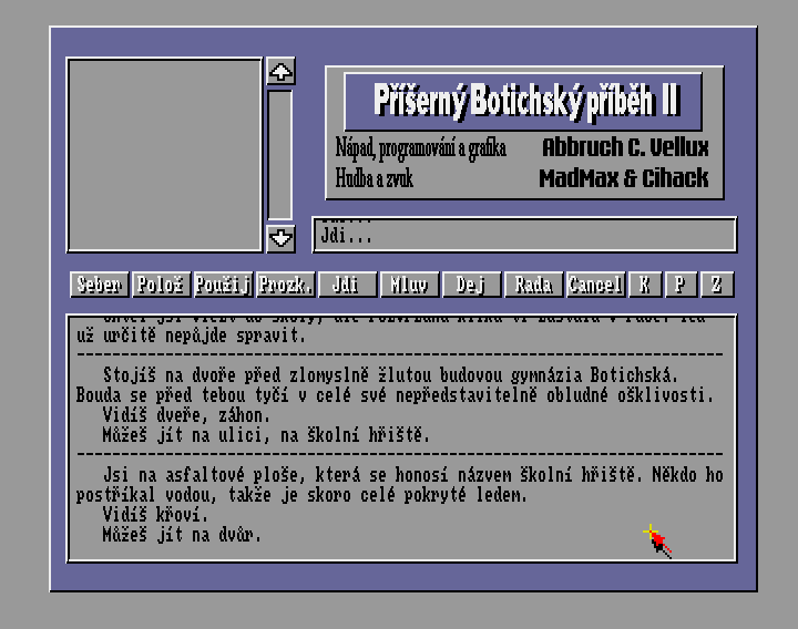 - - parser v českém GFA Basicu, s jednoduchými příkazy (vezmi, prozkoumej, jdi…), a velmi častým zorám nutností hledat alternativní synonyma