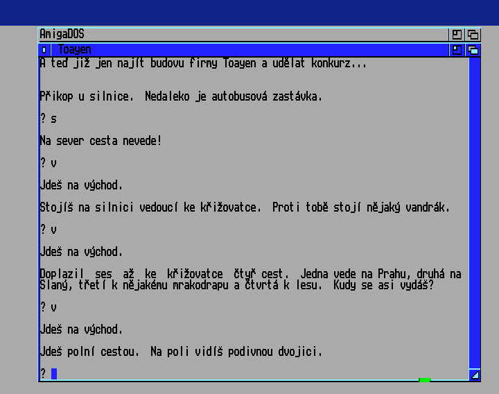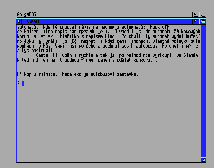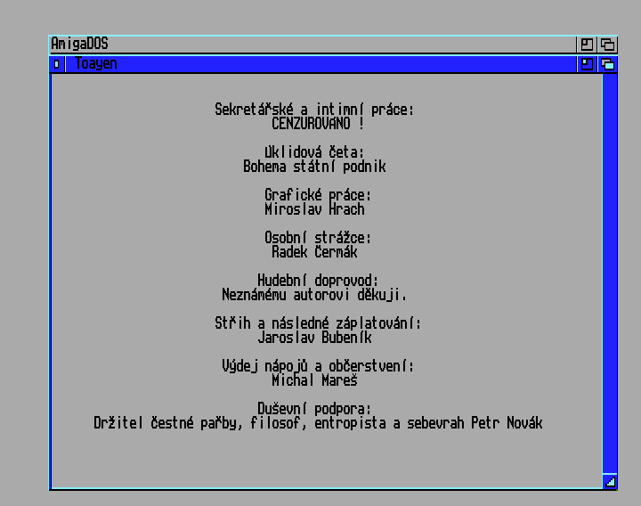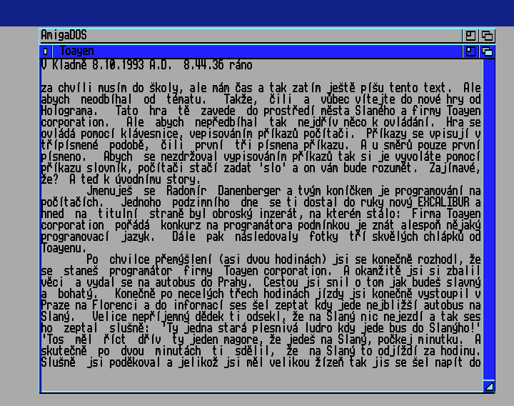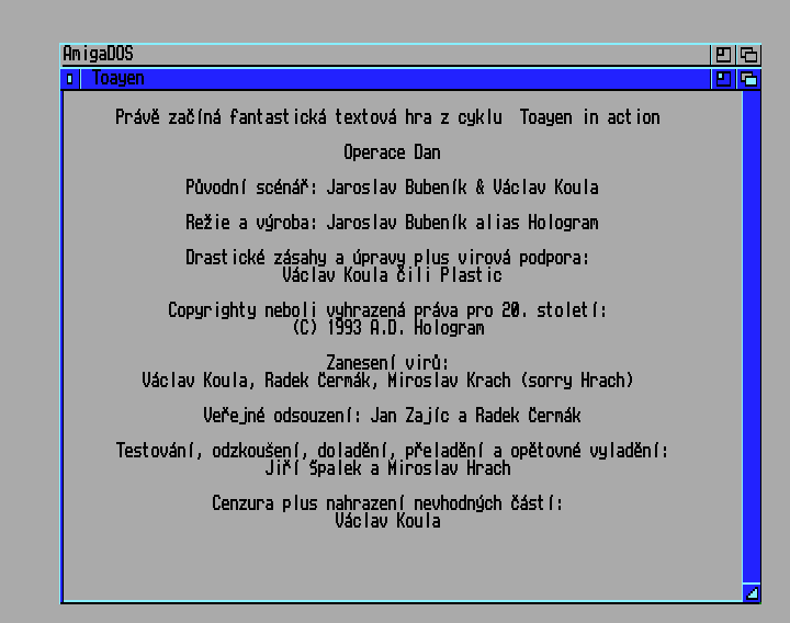 V roce 1993, v době, kdy československá Amiga scéna žila demy, disketami a kamarádskými srazy, vznikla jedna z těch textovek, které si na nic nehrají - a právě proto si je hráči pamatují. „Toayen In Action“ od Holograma ze stejnojmenné skupiny Toayen je sice technicky jednoduchá, ale o to více vyčnívá svým humorem, sebeironií a atmosférou přátelského výsměchu všemu „serióznímu“.