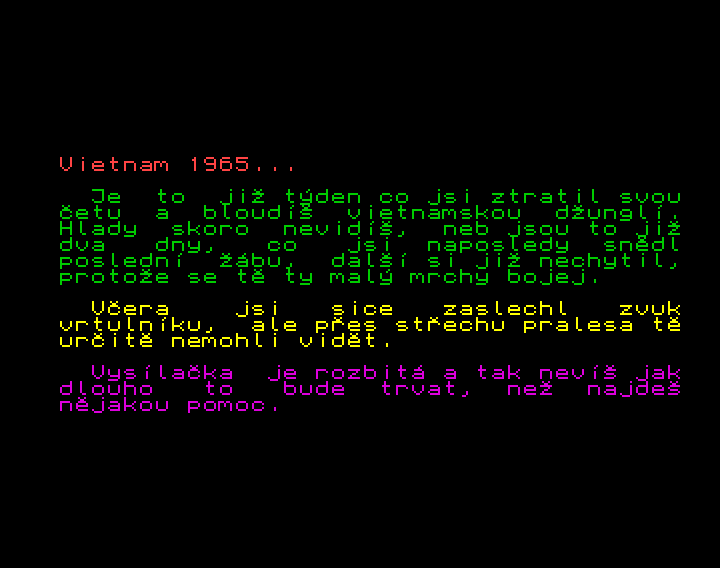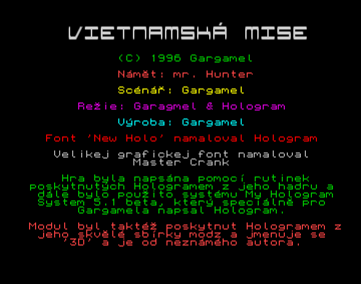 V roce 1996 se na české Amiga scéně objevila drobná, ale svým způsobem osobitá textová adventura s názvem „Vietnamská mise“. Autorem hry je Jaroslav Bubeník alias Hologram, tehdy již známý svými experimenty s vlastním enginem pro textovky. Tento titul měl původně vzniknout jen jako rychlý test nové verze parseru, ale jak už to tak u kreativních lidí bývá, Hologram z původního záměru nakonec vytvořil celou hru - a ne ledajakou.