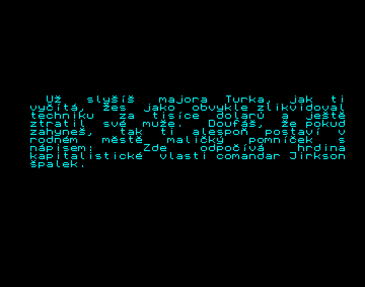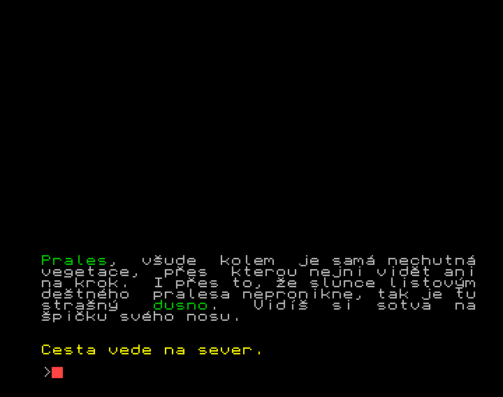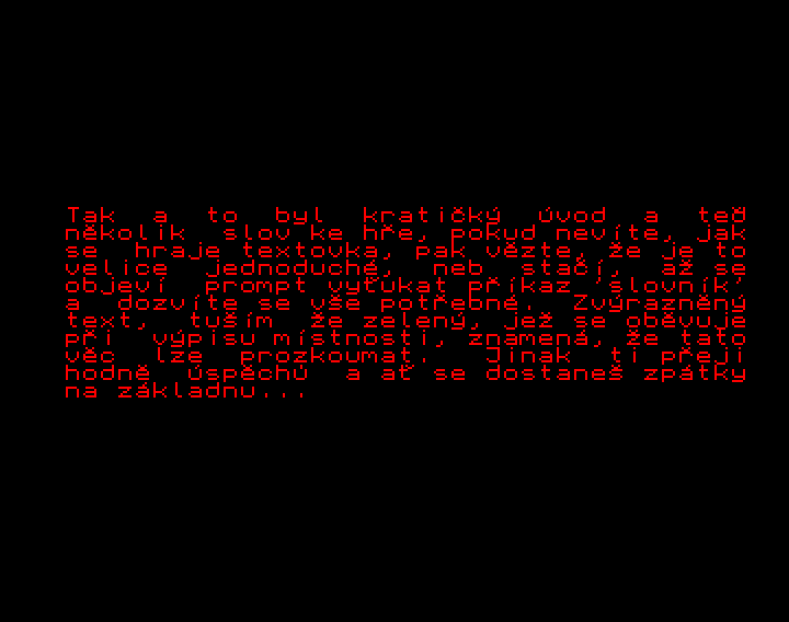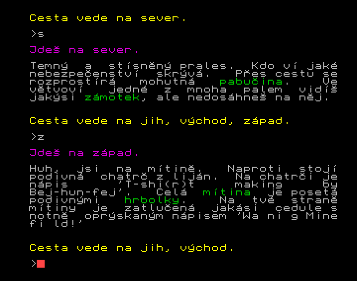 - - Klasická textová adventura s parserem příkazů ve stylu „VEZMI MAPU“, „JDI SEVER“, „PROMLUV S VOJÁKEM“,