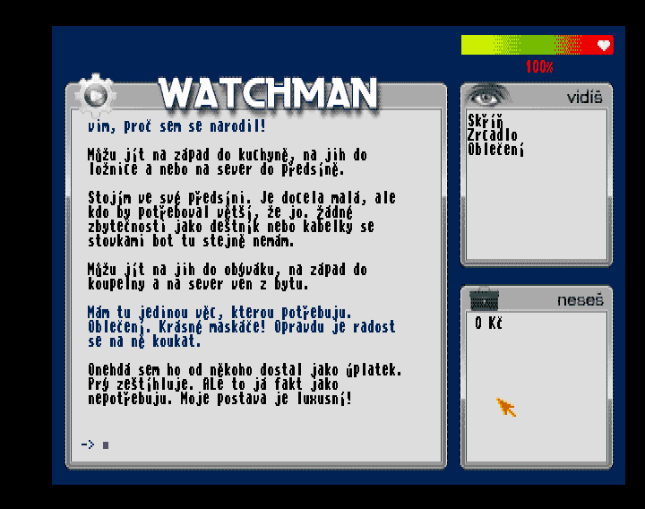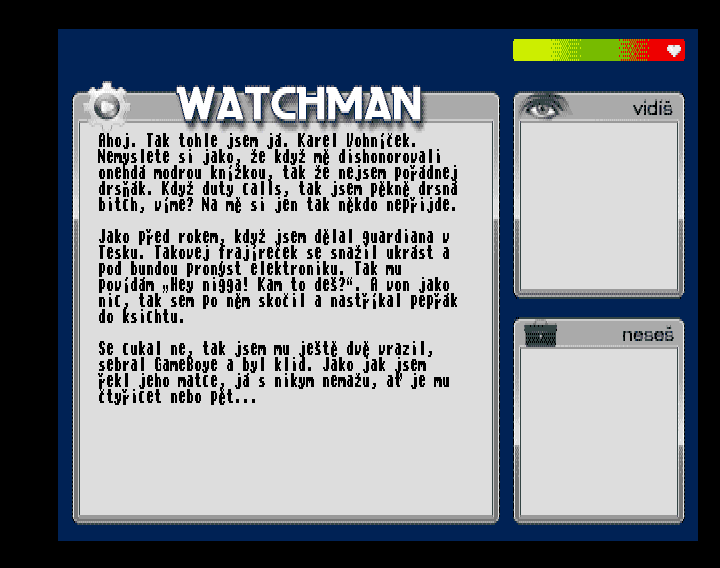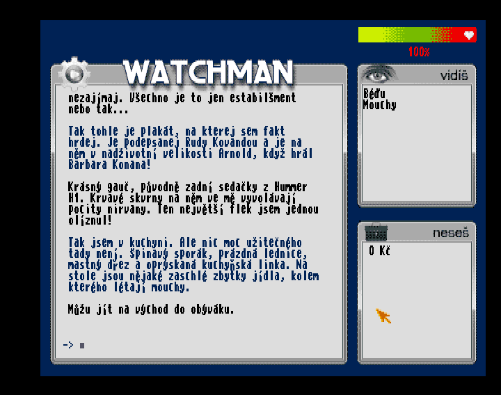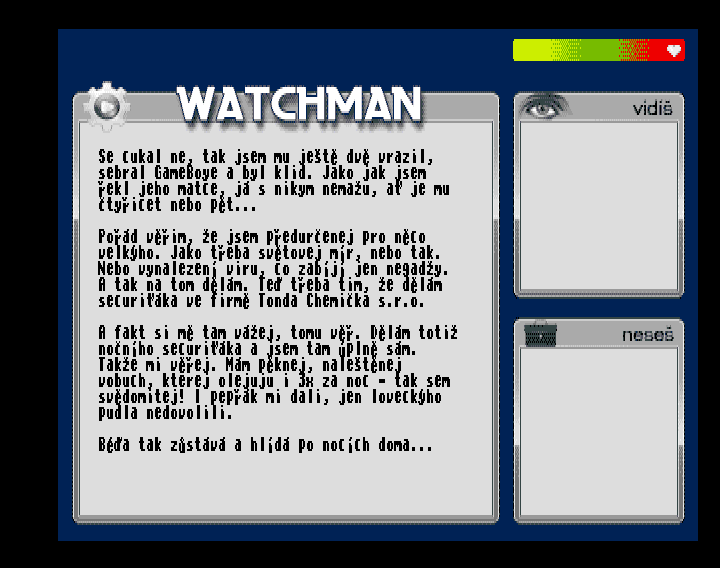 „Watchman“ je textová adventura s duší - paranoidní, zvláštní a sarkastická. I když se jedná pouze o demo, nabízí natolik silný styl a nápadité pojetí hlavní postavy, že zůstává v paměti. Velká škoda, že nebyla nikdy dokončena - mohla to být perla mezi českými textovkami.